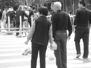 ?。翟拢保谷丈衔纾保啊茫常埃袇^(qū)八一路與育新街交叉口,兩位老人購物結(jié)束,手拎塑料袋,正在等候通過馬路。