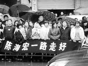 濤聲:2009年3月12日早晨,天空下著雨,上帝為失去一位好檢察官而哭泣!這天是鄲城人民的好兒子陳海宏出殯的日子!早晨8點20左右靈車駛入新華路。路兩邊站滿了送行的群眾,他們戴著白花,手拿條幅。靈車走得很慢,因為它知道海宏哥很累,好讓他多睡一會。海宏哥走好,你是鄲城的嬌傲!