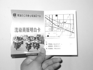 ??? 本報訊??“有了明白卡,知道在哪條路可以經(jīng)營,俺再也不用擔驚受怕地與城管捉迷藏了。”12月2日,鄲城縣公用事業(yè)局向全縣2000多個流動商販每人發(fā)放一張“流動商販明白卡”,卡上清楚地標明30多條可以流動經(jīng)營的街道、兩條嚴禁經(jīng)營的街道和部分限時經(jīng)營的街道,商販一目了然,反應良好。