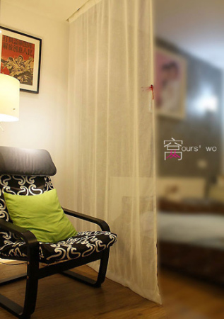由于空間不是很大,在客廳和臥室之間,用了白色飄紗,把兩個空間隔開,淺淺的,可以從臥