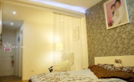 飄紗的選用,既不占用空間,也起了有效的分割空間作用,隱隱約約的,有一點點朦朧的感覺,臥室墻上采用了比較暗色調(diào)的墻紙,看,還有俺倆的婚紗照,是不是很浪漫呢?
