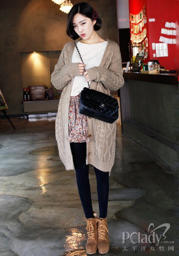 白色T恤打底,內(nèi)扎在重要碎花短裙中,給冷冷的天氣帶來小溫暖哦!黑色褲襪+系帶短靴,拉長腿部曲線,同色系復古長毛衣做外外套,包包和褲襪上下呼應(yīng)