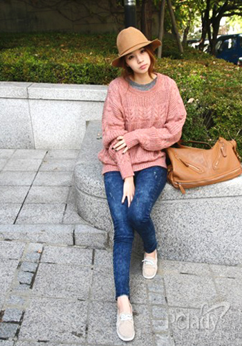 復古不一定就必須有精致小領(lǐng)得襯衫,歐美的MM脖子比較長,其次搭配多了也會厭倦,灰色的圓領(lǐng)T恤看起來是不是更加隨意,肉粉色寬松復古毛衣+深藍色修身牛仔褲,白色小球鞋舒適搭配,帽子雖然作為配飾但是很討巧的給整體加了大分數(shù),和包包呼應(yīng)