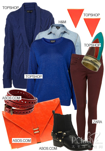 PClady獨家專稿,未經(jīng)許可請勿轉(zhuǎn)載! 小編推薦搭配: 復古翻領(lǐng)開衫毛衣TOPSHOP 寶石藍色套頭針織衫TOPSHOP 棗紅色修身牛仔褲ZARA 熒光橘色三角耳釘 TOPSHOP 金屬扣信封手包 ASOS.COM 金屬扣短靴ASOS.COM 紅色皮質(zhì)手環(huán) ASOS.COM 拼色民族風金屬戒指 TOPSHOP ?