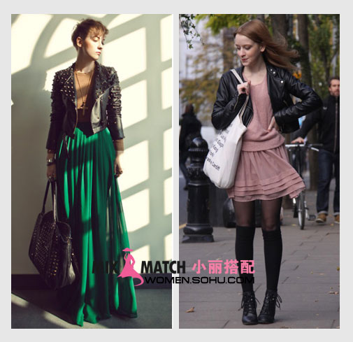 時尚解析:黑色皮質(zhì)夾克搭配雪紡裙裝,兩種對比很強的材質(zhì)相互碰撞混搭出精彩的火花!想要出挑的MM不妨大膽一試,一定會有出其不意的精彩效果