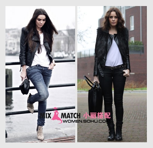 時尚解析:黑色夾克與硬朗褲裝的組合最為經(jīng)典,短款的短夾克搭配上高跟短靴,可以在視覺上拉伸腿部線條