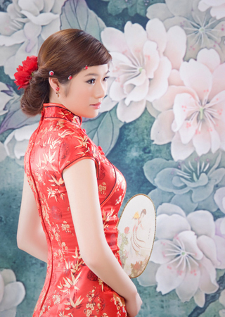 新娘可以盤頭,但也可以考慮不盤頭,長發(fā)自然垂順或燙發(fā)其實(shí)都行的通的。不管梳什么樣的發(fā)型,都應(yīng)考慮用些發(fā)飾,發(fā)飾的顏色應(yīng)是旗袍顏色的同類色,或能呼應(yīng)上,這樣新娘從整體著裝上才會有統(tǒng)一感。頭發(fā)稀少的應(yīng)把發(fā)型做的夸張一點(diǎn)