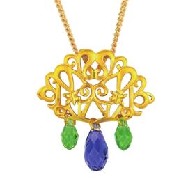 孔雀舞款以孔雀尾巴為主要靈感,主體采用精工縷空的造型,垂墜的藍(lán)綠色水晶為其增添了一抹亮麗。