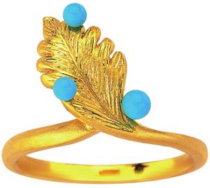 ??? 翠迎朝露款在黃金葉片上點綴了大小不一的綠松石“露珠”,黃金葉片上工匠還勾畫出葉紋,仿佛真的將葉子浸于金水中復(fù)刻那般。讓佩戴者宛若聞到了清晨的新鮮空氣,充滿朝氣地開始新的一天生活,葉片吊墜還可以做胸針,讓整個系列作品顯得清新而別致