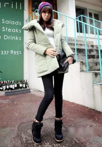 淡綠色羽絨服,大口袋的設計美觀又實用,彩色的毛線帽會讓冬季裝扮更顯活潑,黑色緊身與休閑高幫靴,休閑的裝扮也能充滿女人味。