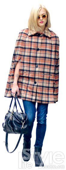 精致的領(lǐng)子裝飾、圓眼鏡與格紋斗篷都表達(dá)著復(fù)古主題!牛仔鉛筆褲與機(jī)車踝靴卻讓整個(gè)Look變得街頭起來,兩種風(fēng)格完美契合。