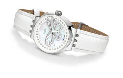 整體的白色設計和銀色的金屬表框,營造出一個冰與雪的世界。珍珠貝母的表盤中央,向右裝飾著59顆鉆石鑲嵌成的蝴蝶造型,與表盤外圈的39顆鉆石相互呼應,優(yōu)雅、精致而浪漫,仿佛是從安徒生《冰雪皇后》中翩然飛出的純美精靈。設計師將反光藍寶石鏡面運用在表殼與表背,精雕細作的自動機芯和自動陀透過透明背底一覽無遺;搭載具有40小時動力儲存的自動上鏈機芯,具備100米的防水深度