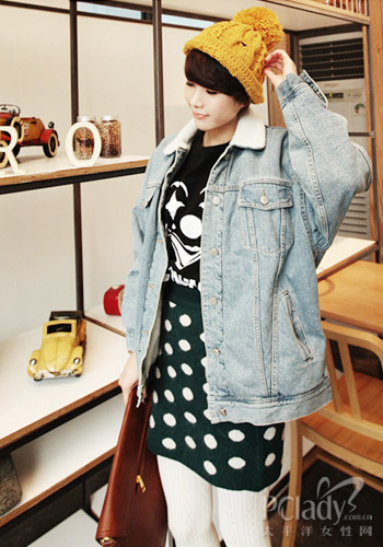 今年Boyfriend中性風(fēng)外套真的很流行,到處都能看到它的身影。簡約的牛仔翻毛夾克帶點(diǎn)帥氣,搭配姜黃色毛線帽盡顯酷感時(shí)尚。內(nèi)搭波點(diǎn)長款毛衣配上褲襪一樣可以穿出個(gè)性魅力來,既有型又盡顯纖瘦筆直的美腿線條,大家不妨嘗試一下