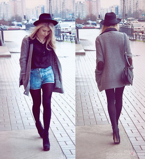 1. 開(kāi)襟灰色針織毛衣可以搭配在黑色襯衫和牛仔褲外,如果你想要與眾不同的感覺(jué),那就選擇一款黑色寬檐帽作為配飾,搭配黑色Legging和高跟鞋,就非常有味道了。