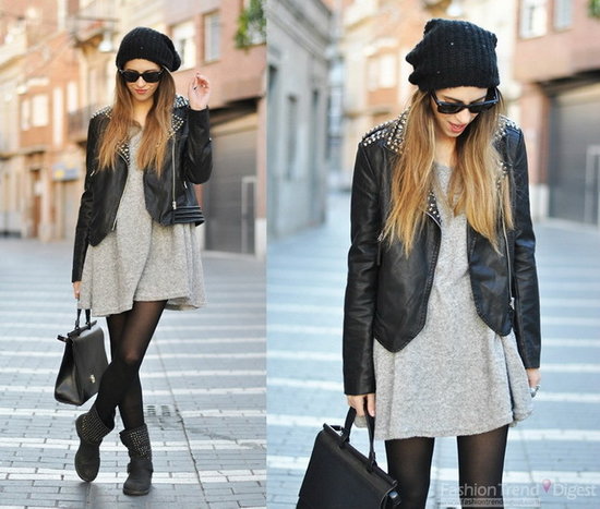 2. 一件寬松的灰色棉質(zhì)裙可以直接打底穿著,搭配一款鉚釘飾的黑色皮夾克和及踝靴,輕松塑造出層次感,同時(shí)黑色針織帽和墨鏡也是必不可少的配飾