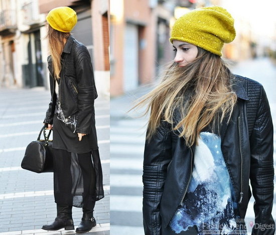 5. 這位大人選擇了多層次的搭法,最里面是一件See-Through的黑色薄紗長(zhǎng)裙,外搭一件剛好遮蓋臀部的印花T恤,最后搭上一件黑色機(jī)車夾克,戴上一頂芥末黃的針織帽,非常特別的裝扮。