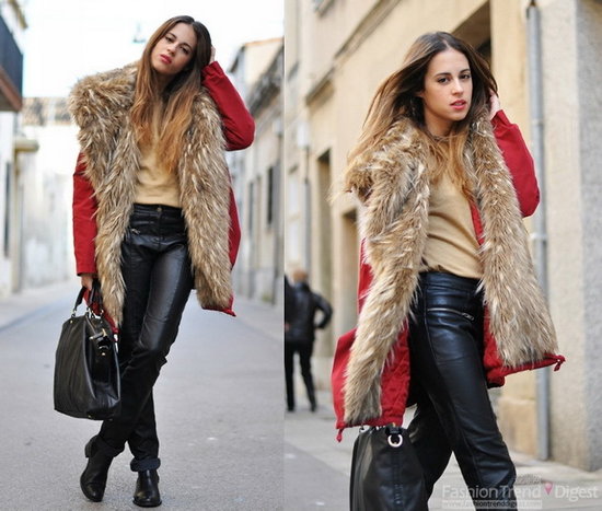 6. 襖子可謂是冷冬最御寒的單品了,如果單一的紅色有些乏味,有一些皮草的拼接就能增加奢華感,下身的黑色皮褲塑造出勁酷十足的街頭風(fēng)