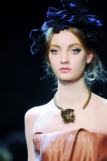 Lanvin秋冬秀場有春天足跡,柳垂,風(fēng)來,花開,蝶舞,模特Codie Young纏繞于頸間的金色花朵項(xiàng)鏈,將裸色露肩小禮服的素淡化為耀眼。