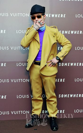 日本多棲藝人Verbal 身著芥黃色西服套裝和Prada香芋紫針織衫,混搭水波浪藍襯衣,可謂和諧。而黑色配飾又讓這整身行頭顯得有力度。