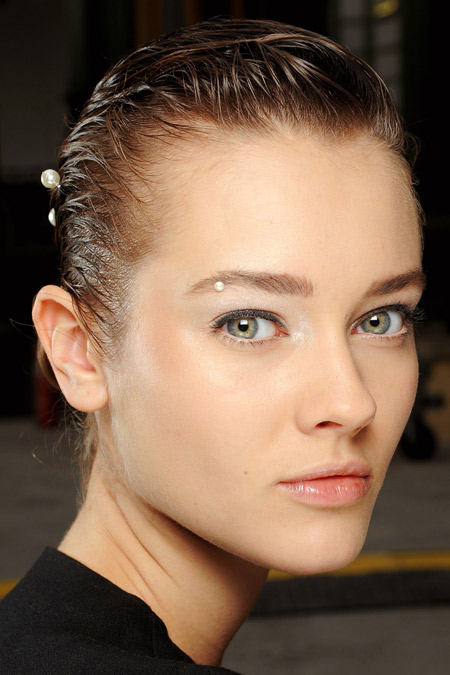 ??? 香奈兒 (Chanel) 2012春夏巴黎時裝周秀場上,彩妝師Peter Philips 把妝容重點放在光澤上,體現(xiàn)出唯美純凈和淡淡的奢華,與裝點的施華洛世奇半圓形珍珠相映生輝。他用白皙又有光澤的底妝配上了粉色珊瑚色的腮紅,濕潤并微閃光澤的眼影,最后以黑色的眼線收尾。嘴唇上也帶著微微的珠光,最亮的只有粉色唇彩和被貼在模特的眉毛、耳朵和鼻側(cè),或者濕潤的頭發(fā)上的白色珍珠。