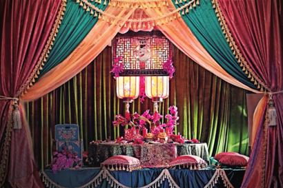 雖然在大部分婚禮上,新郎、新娘穿的都是西式的禮服式婚紗,但在婚禮的格調(diào)和裝飾上,大紅元素仍然是最受新人歡迎的系列,即是在平常日子,都有50%的新人會選擇這個色系,理由是喜氣、熱鬧、華貴、老人喜歡。而到了年底,比如元旦或春節(jié),更有將近70%的新人會選擇大紅色。然現(xiàn)在的紅色婚禮,絕不走過去那種“抬花轎+掀蓋頭”的老套情節(jié)。新人的要求是中西結(jié)合,紅要紅的典雅,富貴要富貴得有層次。此處要傳授大家一個小訣竅,有事沒事跑幾趟古玩市場、二手市場,花小錢淘一些好東西,經(jīng)過改裝就能讓婚禮上的大紅變得豐富而有韻味