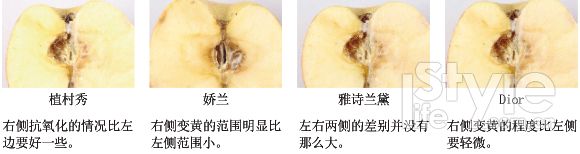 在一半蘋果上涂產(chǎn)品,30分鐘后觀察蘋果變黃的情況,來(lái)判斷抗氧化功效。