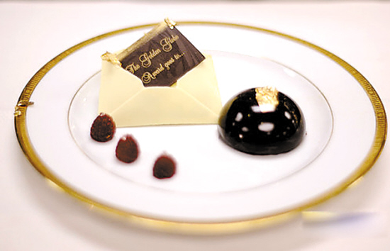 與奧斯卡頒獎(jiǎng)典禮上嘉賓們?cè)谂_(tái)下依次坐好不同,金球獎(jiǎng)?lì)C獎(jiǎng)禮是以宴會(huì)的形式款待1300位嘉賓的。引發(fā)爭(zhēng)議的這種巧克力布丁甜點(diǎn),由酒店甜點(diǎn)大廚托馬斯·亨齊耗時(shí)6個(gè)月設(shè)計(jì),用杏仁制成,并用刺槐蜂蜜、焦糖和新鮮漿果裝點(diǎn),表面還撒有每克價(jià)值高達(dá)135美元的食用金箔。亨齊手下40名大廚和110名員工加班加點(diǎn)才制作完成了宴會(huì)所需的千多份甜點(diǎn)。亨齊解釋在布丁上撒金箔的創(chuàng)意時(shí)說(shuō),這樣做使得甜點(diǎn)與金球獎(jiǎng)的意蘊(yùn)相得益彰,金箔甜點(diǎn)與當(dāng)晚向嘉賓們提供的2002年份的酩悅香檳可謂絕妙配搭。