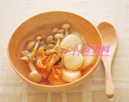 材料:叢生口蘑30克、泡菜30克、面筋5個(gè)、鹽少許、胡椒粉少許,水200毫升。
