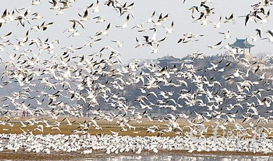 每年春季候鳥從南方回歸,丹頂鶴、黑嘴鷗、天鵝、大雁、野鴨等眾多鳥類在這里停留休憩,繁殖生息。這里有國家一類保護動物9種,是丹頂鶴產(chǎn)卵的最南限,也是黑嘴鷗種群最大的繁殖地和棲息地,備受國際濕地和自然保護組織的重視。