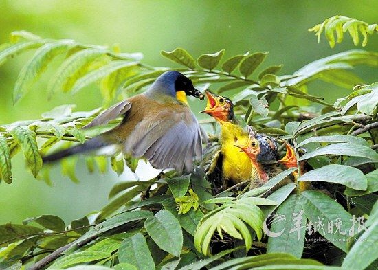 江西省婺源縣,黃喉噪鹛在哺育幼鳥 沈俊峰 攝