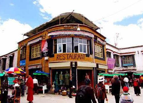 如今的瑪吉阿米僅僅是個(gè)位于八廓街某個(gè)角落的一座3層黃色小樓,一間藏、西、中、尼餐相結(jié)合的餐廳。其內(nèi)部裝修帶有濃郁的藏式風(fēng)味,色澤陳舊、樣式古樸的木桌木椅仿佛傳承許久的故事一樣承載了太多的歲月。木椅上厚厚的座墊又極好地消除了木制的疏離感,讓人可以比較舒服地窩進(jìn)椅中,窩在桌旁。既然窩得那便有閑時(shí)間閑心情去打望,而瑪吉阿米真是個(gè)極好的打望地兒。二樓和三樓都有極好的俯瞰視野,八廓街上的林林總總?cè)渴杖胙壑?,而其中流?dòng)的人群更是清清楚楚,你看你看,美女帥哥的臉漸漸在走近……