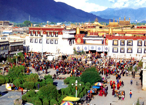 太多太多有聊無(wú)聊的人泡在大昭寺廣場(chǎng)或曬太陽(yáng),或閑坐著發(fā)呆,或看游人信徒來(lái)了又走。大昭寺廣場(chǎng)前的石板被磕長(zhǎng)頭的信徒們用身體打磨得發(fā)亮,積年累月,這里積累了太多的虔誠(chéng)和信仰,讓人走過(guò)時(shí)不由得肅然起敬。