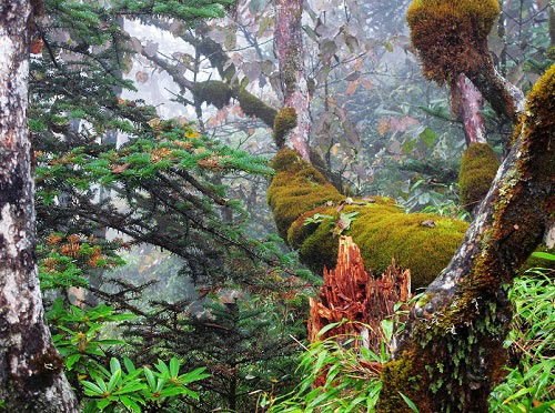 ·溝里天氣變化無(wú)常,本來(lái)還是晴好天氣,一陣山霧襲來(lái),卻淅淅瀝瀝地下起了山雨,沒(méi)帶傘也沒(méi)關(guān)系,反正雨也不大。山雨和迷霧中,黑竹溝又憑添一種水淋淋的嫩綠和清新,憑增一份神秘的迷幻和空朦。