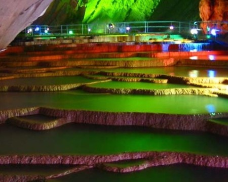 ??? 順著巖洞長長的石階往下走,遠遠地便能望見洞內各色迷離的燈光,巨大的光柱打在巖壁上,晃動變化,照出各式各樣的嶙峋怪石,帶來一種隱秘的刺激和興奮感。雖然還是下午,可是洞里卻如同午夜,伸手不見五指;這樣卻反倒凸顯出舞臺效果之好,所有光亮都集中于一處,成為視線的焦點,溶洞真是天然的大舞臺。