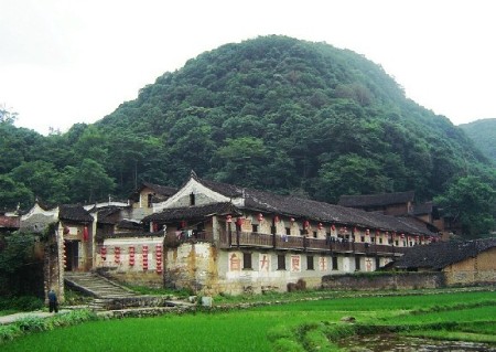 ??? 步入村內,立即就被青石墻壁迷住,一塊塊淡青色的磚石排列出整齊的圖案,大概是山石鑿出的緣故,石質堅硬細膩,手感有微涼。偶爾有小棵的雜草頑強地插足于石縫之間,幽綠的葉子倒垂下來,頗具韻味。屋子的檐角都是高蹺而起,由整齊的黑瓦壘成,映襯著藍天,明明是尖銳的,卻讓人覺得舒服平和。愛極了這樣的南方建筑,好像每一處張揚都是低調的,溶解在青石黑瓦的寡淡里,無言地講述著一方的處世哲學。