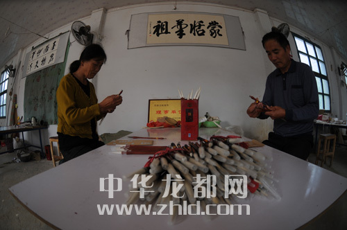 ????提起汝陽劉毛筆,劉四平滔滔不絕。“汝陽劉毛筆選料考究,兔毫的選擇標(biāo)準(zhǔn)是秋毫取健,取尖,春夏毫則不要;狼毫必須要到東北去采集過冬的黃鼠狼尾毛來制作。”談話間,劉四平順手拿起一支毛筆,說:“汝陽劉毛筆制作很精細(xì),主要工藝流程有:分毛-脫脂-去絨-裝毛-齊毛-墊毛-切毛-梳毛-修毛-成頭等128道工藝,成品具備尖、圓、齊、健‘四德’,軟硬適中的標(biāo)準(zhǔn);其外飾,尤其是筆桿的裝飾極為講究,根據(jù)筆的形狀和高、中、低檔的要求配之,既美觀又大方?!?/p>