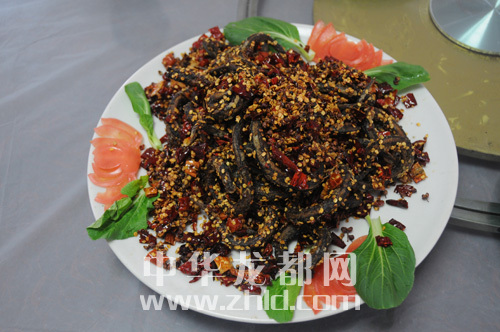 ????到了孫店鎮(zhèn),不吃“干煸盤龍鱔”是種遺憾。這里的“干煸盤龍鱔”不僅選料考究,而且做工精細(xì)。鱔魚必須選擇顏色呈黑褐色的天然生黃鱔,辣椒以紅色為宜。做法要經(jīng)過泡、燙、炸、煸炒等工序。“干煸盤龍鱔”具有極高的營養(yǎng)價值和藥膳作用。“辣而不膩、麻而可口!”記者品嘗了剛做好的“干煸盤龍鱔”,發(fā)現(xiàn)風(fēng)味果真獨特。