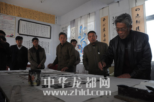????作為距離太康縣城最遠的一個邊界鄉(xiāng)鎮(zhèn),轉樓鄉(xiāng)的文化活動開展得有聲有色。該鄉(xiāng)依托文化站,成立了在鄉(xiāng)一級少見的文聯(lián),下設書法家協(xié)會、腰鼓協(xié)會、嗩吶協(xié)會等。我們在轉樓鄉(xiāng)政府采訪時,正碰上書法家協(xié)會20多名會員在一起切磋書藝。今年74歲的許家榮是鄉(xiāng)書法家協(xié)會主席,也是《周口晚報》的老讀者,看到我們到來,老人興之所至,當場揮毫潑墨,為本報題寫了“周口邊界行接地氣有人氣”的條幅。據(jù)了解,每逢春節(jié),書法家協(xié)會會員都會走村串戶,為村民義務書寫春聯(lián)。