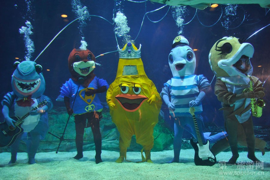 ????北京海洋館的五個吉祥物組成的團體堪稱全國首個水下偶像樂團。此次新春首秀,精心編排的樂器演奏及獨具特色的水下炫舞都將為游客帶來了全新的視聽享受。藍色水池為舞臺,國寶中華鱘為舞伴。主唱海獅激情高歌,吉他手海豚、鯊魚與薩克斯中華鱘伴奏,海星隨著音樂節(jié)拍舞動著身體……以往人們看到的卡通人偶是在陸地上表演的,不受壓力與浮力的限制,活動靈活自如。但是在水下想要完美演繹既定動作需要潛水員具備高超的技能、過硬的心理素質、充沛的體能和幕后辛苦的排練。