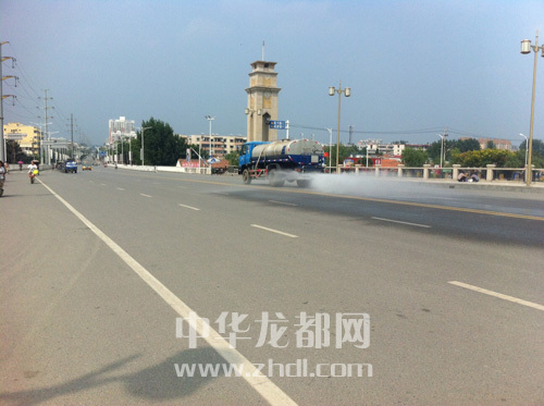 ????雖然已經(jīng)立秋,可天氣依然炎熱。為此,周口市城管部門出動(dòng)灑水車在街頭灑水降溫,以減小“秋老虎”的威力。灑水車過后,噴出的水霧讓人頓時(shí)感覺一陣清涼,既有效緩解了炙熱的高溫環(huán)境,又起到了壓塵、降溫、加濕、潔凈路面的功能。圖為8月21日14時(shí)許,一輛灑水車在周口市區(qū)八一大道大橋?yàn)⑺?/p>