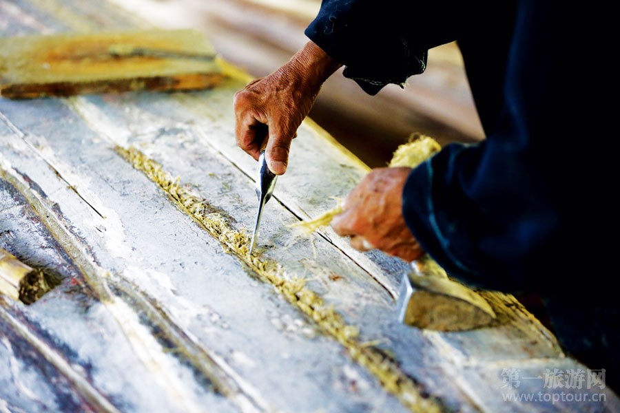 ????為防漏,要把麻線(xiàn)一點(diǎn)點(diǎn)打進(jìn)船底縫隙處。