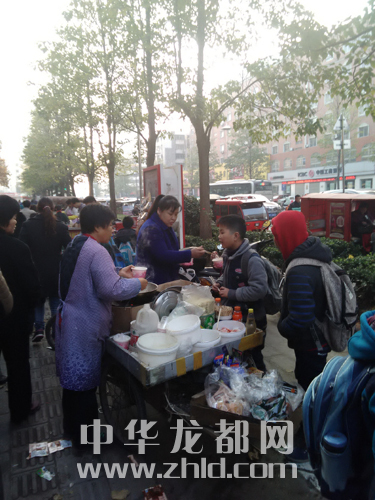 ???????11月18日7時許,記者在大慶路與育新路交叉口東側(cè)看到,從這里到周口市第一初級中學(xué)門口數(shù)百米人行道上,經(jīng)營奶茶、面包、豆?jié){等食品的流動攤販有一二十個,并且每個攤位前都圍著不少學(xué)生(如圖)。