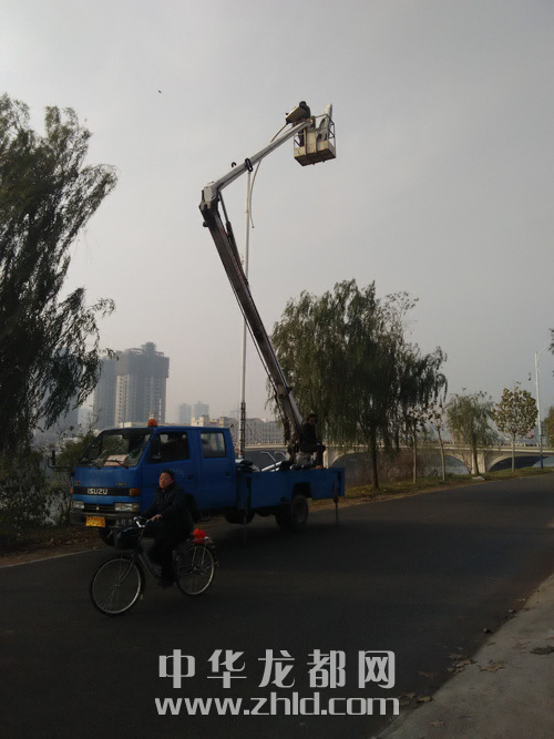 ???????12月10日,在周口市區(qū)潁河路(八一大道至大慶路段),幾名工作人員正在更換路燈。當(dāng)日,雖然氣溫很低,但工作人員卻沒有因此而退縮,站在五六米高的吊車上更換路燈,以方便行人。