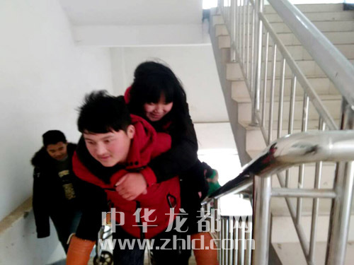 ????雷偉每隔幾天就背一次孔雪珂,這已成了他學(xué)校生活的一部分?!俺宋冶晨籽╃嫔舷聵峭?,我們班其他26個男生也都背過她。我作為班長,理應(yīng)多做一些?!卑芽籽╃姘踩偷浇淌?,雷偉有點不好意思地說,“第一次背她,我有點兒害羞,但如今已經(jīng)習(xí)慣了?!?/p>