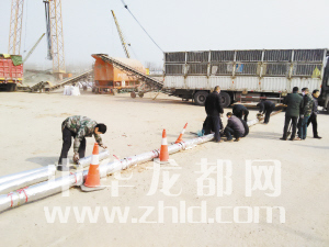 ?工人鋪設(shè)卸載瀝青的管道