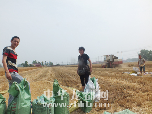 ??? 昨日,鄲城縣小麥?zhǔn)崭罾_(kāi)序幕。圖為該縣城郊鄉(xiāng)小麥?zhǔn)崭瞵F(xiàn)場(chǎng)。(記者 盧好亮 通訊員 孫守功 攝)