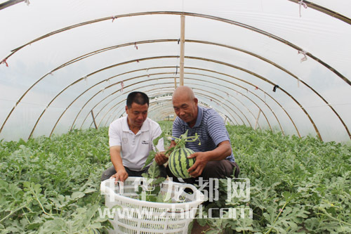 ?? 近日,項(xiàng)城市南頓鎮(zhèn)大棚西瓜基地開(kāi)園,培育的“半截樓”8428西瓜,因果瓤脆嫩、味甜多汁走俏市場(chǎng)。該基地?fù)碛写笈?0多個(gè),占地面積120多畝,畝均收入2萬(wàn)多元。圖為該基地工作人員在采摘西瓜?! 。ǚ簿颁h 攝)