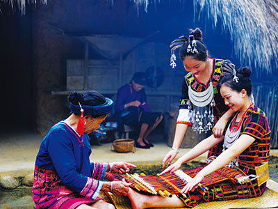 ????當(dāng)?shù)貗D女在景區(qū)為游客展示織繡 檳榔谷景區(qū)供圖