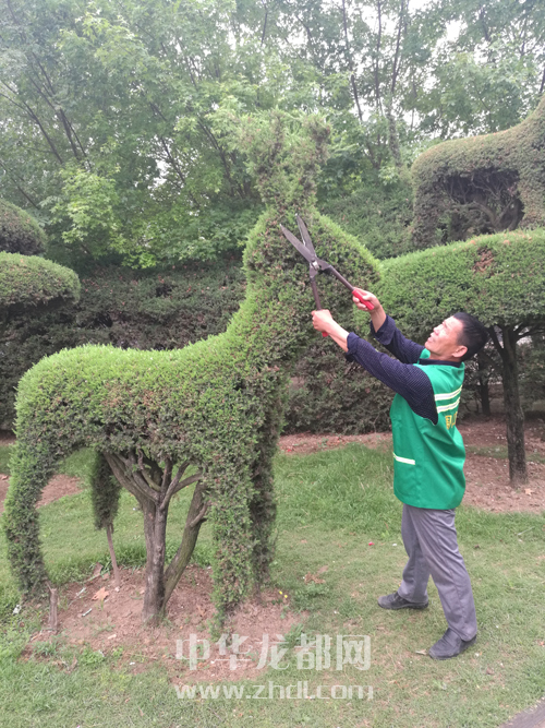 ????在市人民公園,周口晚報記者見到王廷林時,他正在拿著剪刀給樹木修剪枝條。經(jīng)過他的修剪,園里的樹木呈現(xiàn)出各種形態(tài):“花瓶”、“孔雀”、“駿馬”……形態(tài)各異的造型中,一棵“二龍戲珠”的景觀樹,視覺效果極佳,這是王廷林的得意之作。