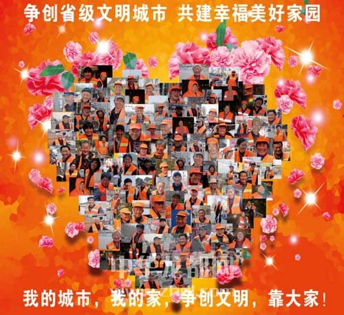 ????本報(bào)訊 經(jīng)過(guò)幾個(gè)月的跟蹤拍攝,熱心市民王銀行已為周口中心城區(qū)的300多名環(huán)衛(wèi)工人拍下笑臉和工作照。得知我市目前正在創(chuàng)建省級(jí)文明城市,王銀行特意用這些笑臉照片制作了一組以“我的城市我的家 創(chuàng)建文明靠大家”為主題的宣傳海報(bào)。此外,王銀行的朋友還為環(huán)衛(wèi)工人譜寫一支歌曲。